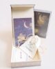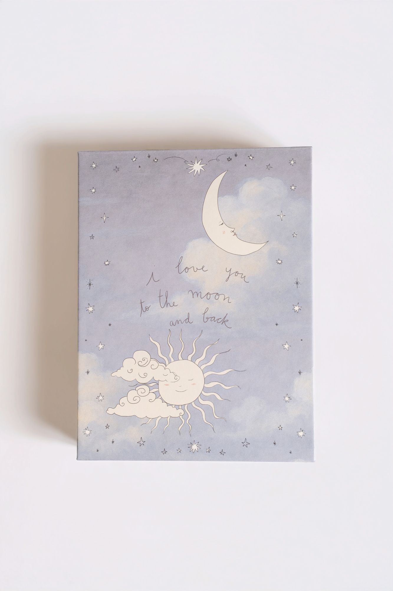 La caja está fabricada en cartón rígido de alta calidad con cierre imantado y diseño ilustrado en tonos azules suaves, inspirado en un cielo de ensueño con sol y luna y el mensaje “I love you to the moon and back”. Diseñada por Natalia Swarz, puede reutilizarse para guardar recuerdos o decorar la habitación del bebé.