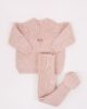 Este set de punto rosa para recién nacido es una pieza delicada y atemporal, pensada para los primeros días del bebé. Su diseño limpio, acompañado por el detalle de la flor, lo convierte en un conjunto especial sin perder comodidad.