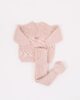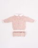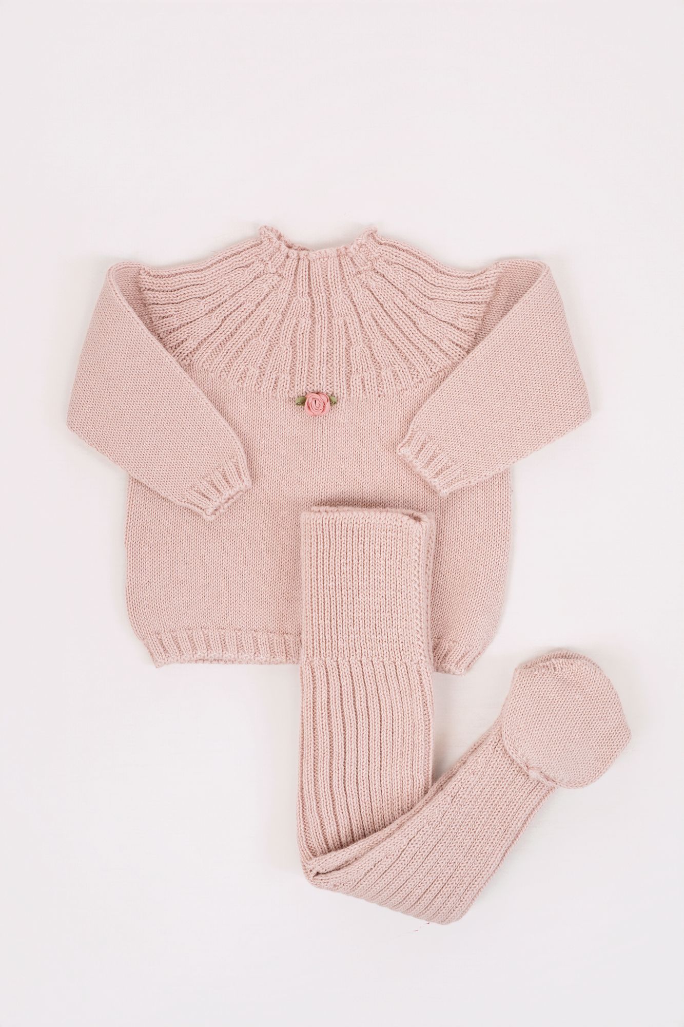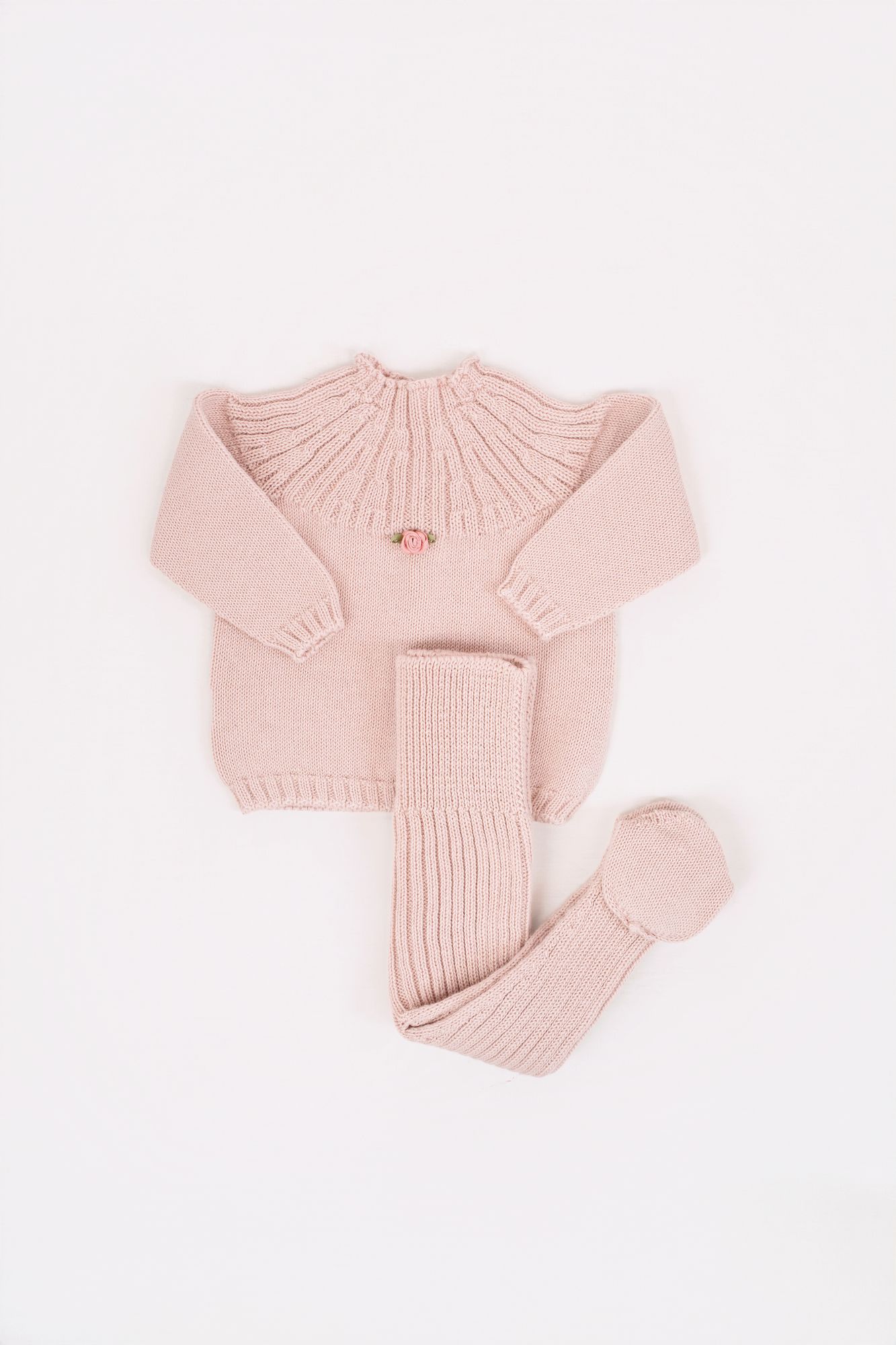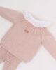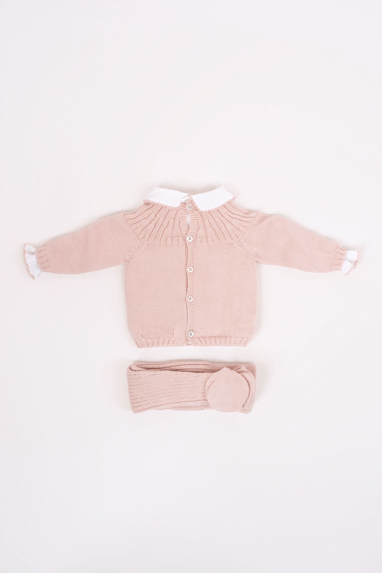 Set de punto para recién nacido en tono rosa suave, con cuello volante blanco y delicado detalle floral. Un diseño cómodo y elegante, ideal para los primeros días del bebé.
