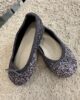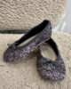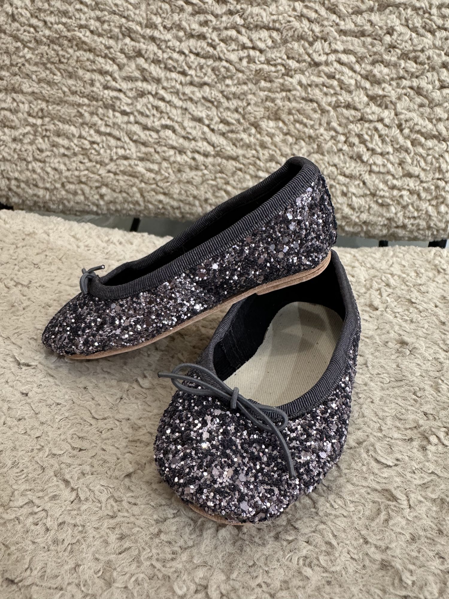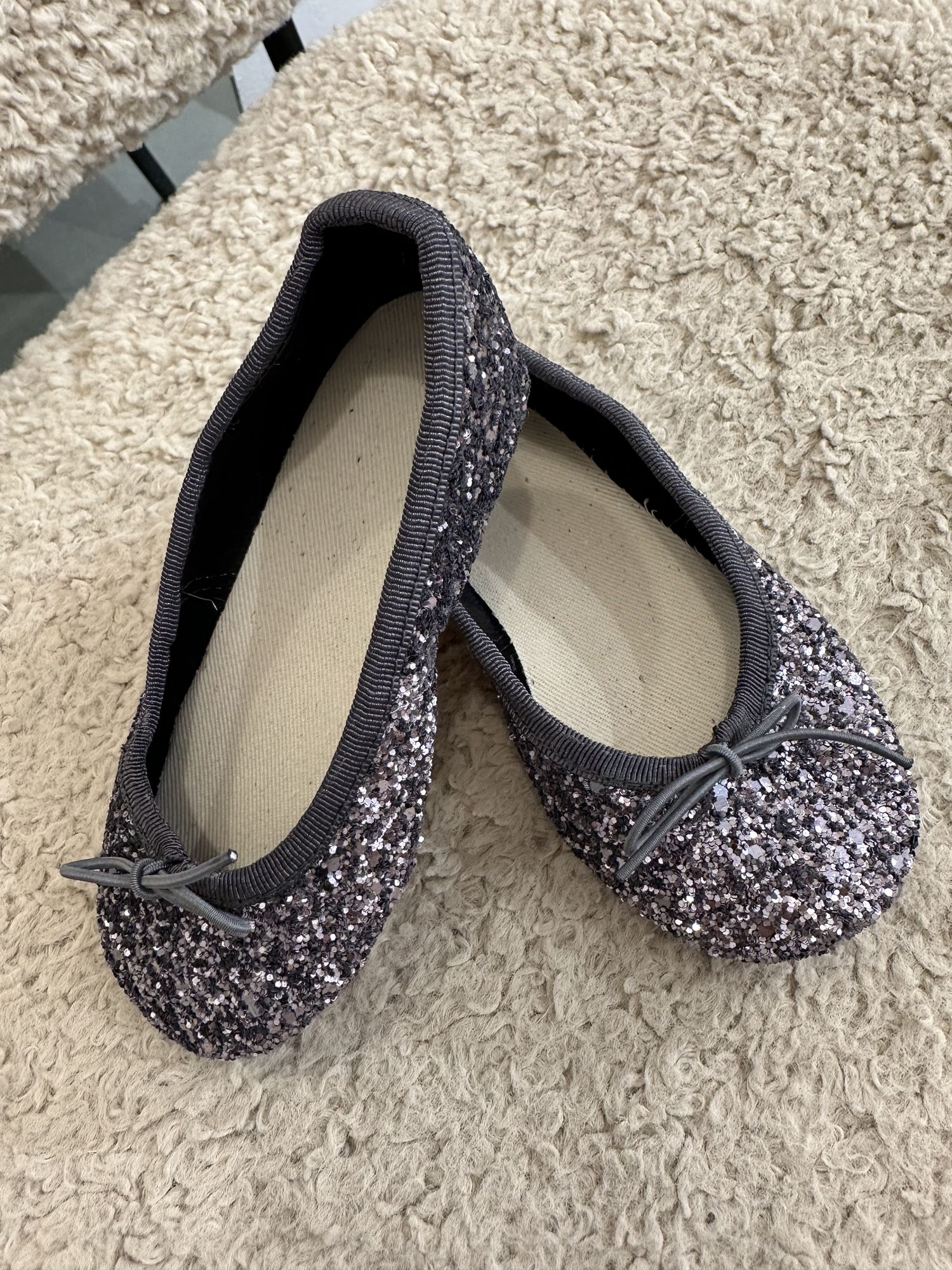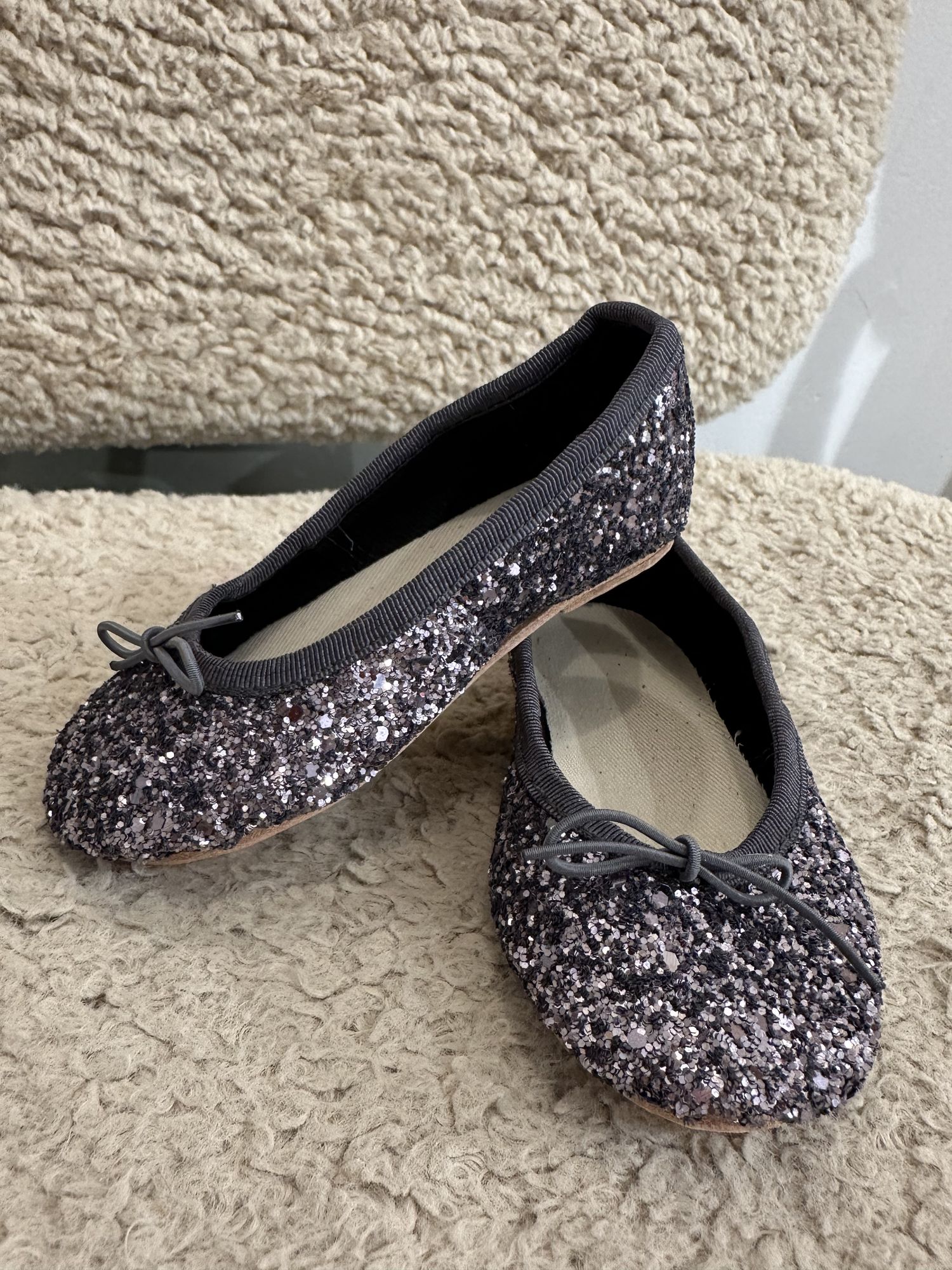 Bailarina de niña con suela blanda y goma elástica en el lazo. Diseño en purpurina gris antracita, cómoda y fácil de combinar. Si dudas entre dos tallas, elige la mayor.