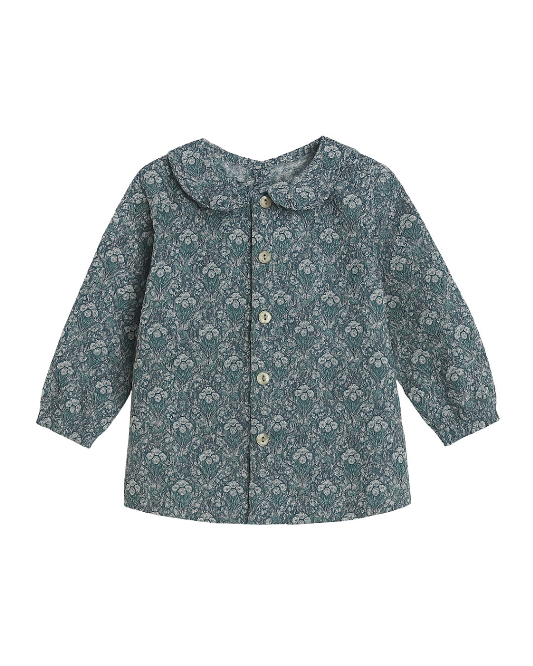 Blusa de niña confeccionada en algodón 100% con un delicado estampado floral verde de aire vintage. Su diseño clásico con cuello redondo, manga larga y cierre frontal con botones la convierte en una prenda versátil, ideal para combinar con faldas, pantalones o ranitas.