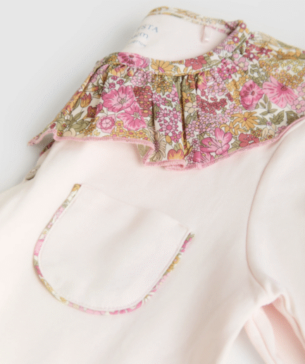 Pijama pelele niña con pie y canesu de volante rosa tiza/crudo